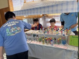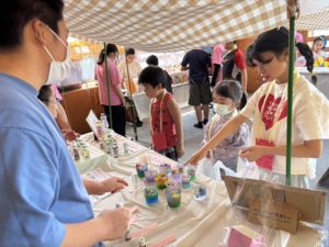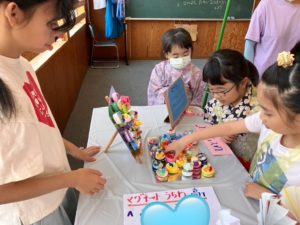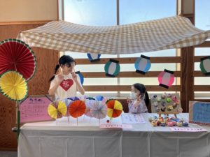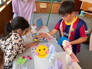 お店屋さんを開いて、一つひとつ子ども達が手作りをした雑貨を店員さんとお客さんになりきって、売ったり、買ったりの体験をしました。  後日、藤枝校のお友達もお客さんとして遊びに来てくれましたよ。